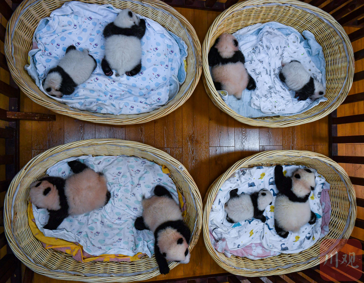 9月22日,阿坝州汶川县,中国大熊猫保护研究中心神树坪基地的育幼室内,8只大熊猫幼崽在竹筐里休息,这是2021年出生的部分幼崽。