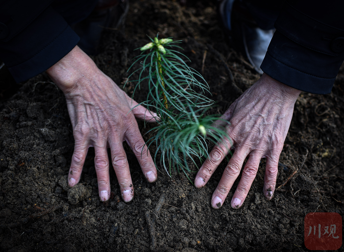 3月11日,81岁的李秀雄老人在荒山上栽种下树苗,23年里老人带领一家人在自贡市荣县的林场中造林3000亩植树40万棵,昔日荒山变青山。