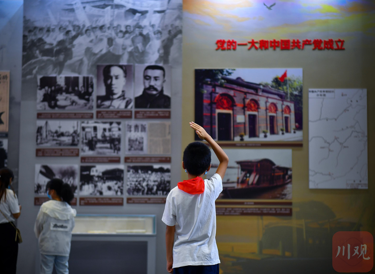 8月29日,一名小学生在“壮丽史诗 伟大飞跃——四川省庆祝中国共产党成立100周年主题展览”上致敬革命先辈。