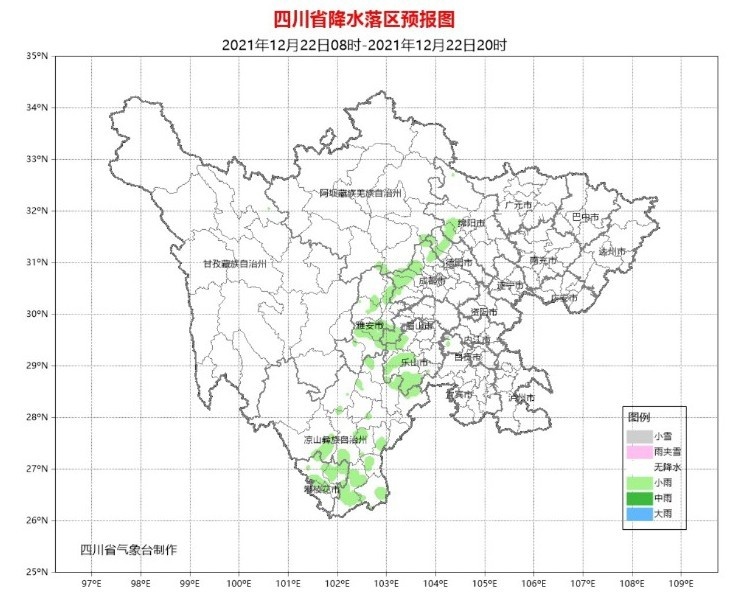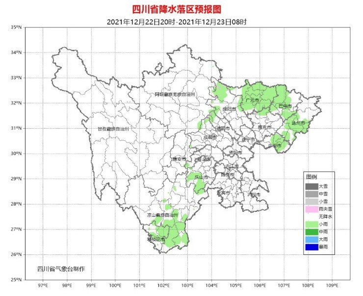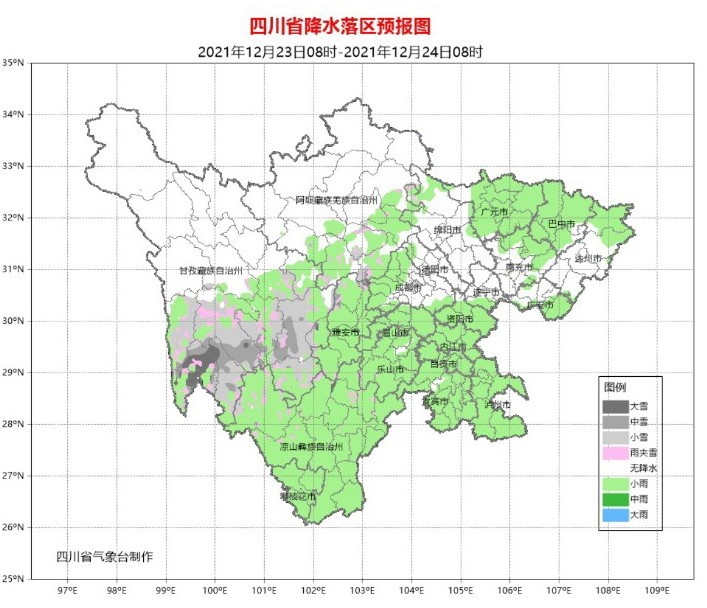 四川省气象台预计,23日白天到晚上,盆地大部阴天有小雨或零星小雨;川西高原北部多云间晴,南部阴天间多云有阵雨(雪),局地有中大雪;攀西地区阴天间多云。