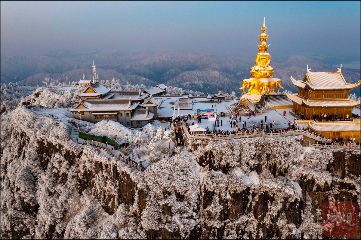 1月1日早7点50分,来自各地的游客在世界自然文化遗产峨眉山的金顶迎接新年第一缕阳光。