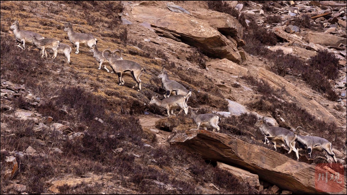 1月9日,川青甘交界的自然保护区,岩羊一家在头羊的带领下沿着陡峭悬崖觅食。