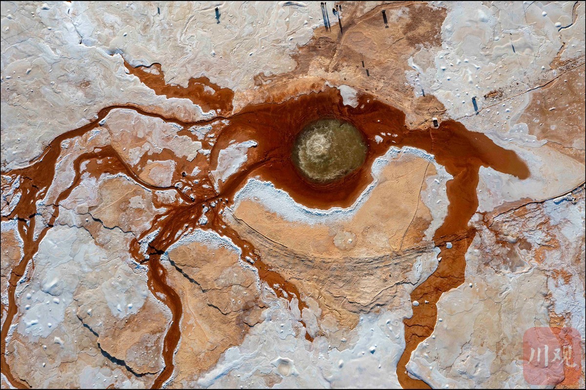 1月11日,空中俯瞰艾肯泉,仿佛一只镶嵌在大地上的眼睛。它位于青海省茫崖市花土沟镇,被称为“大地之眼”。