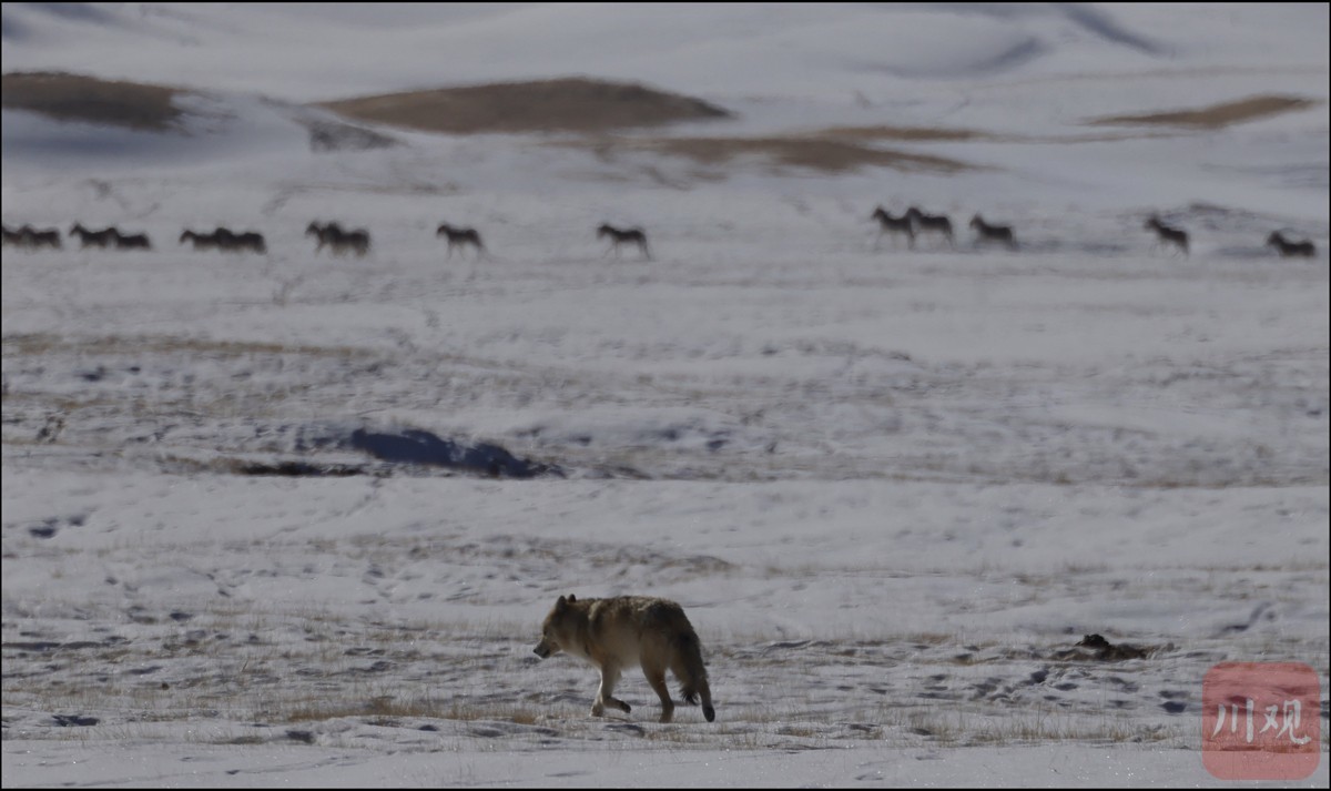 1月13日中午12点,在青藏高原川青交界自然保护区,一只独狼正在跟踪一群野毛驴。