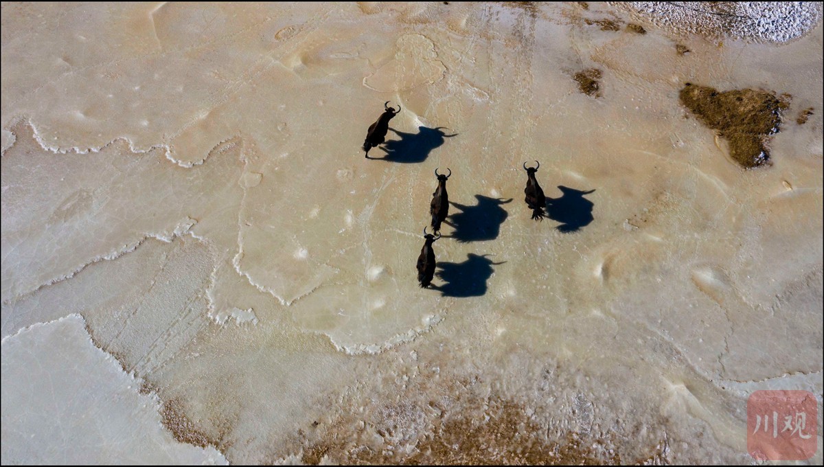 1月15日,位于石渠县的高原自然保护区,一队野牦牛正在渡过冰河。