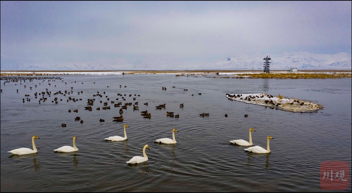 3月6日,若尔盖湿地国家级自然保护区在花湖设立的高科技无人观测塔(右后)正全天候观察湿地鸟类的活动。