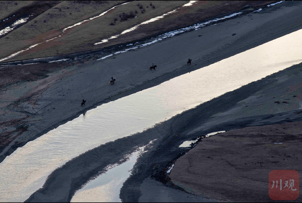 3月12日,牧民巡河员骑马在阿坝县曼札塘湿地保护区巡视。这里有十分丰富完整的高原湿地生态系统和动植物资源,是黄河上游重要的水土保护区。