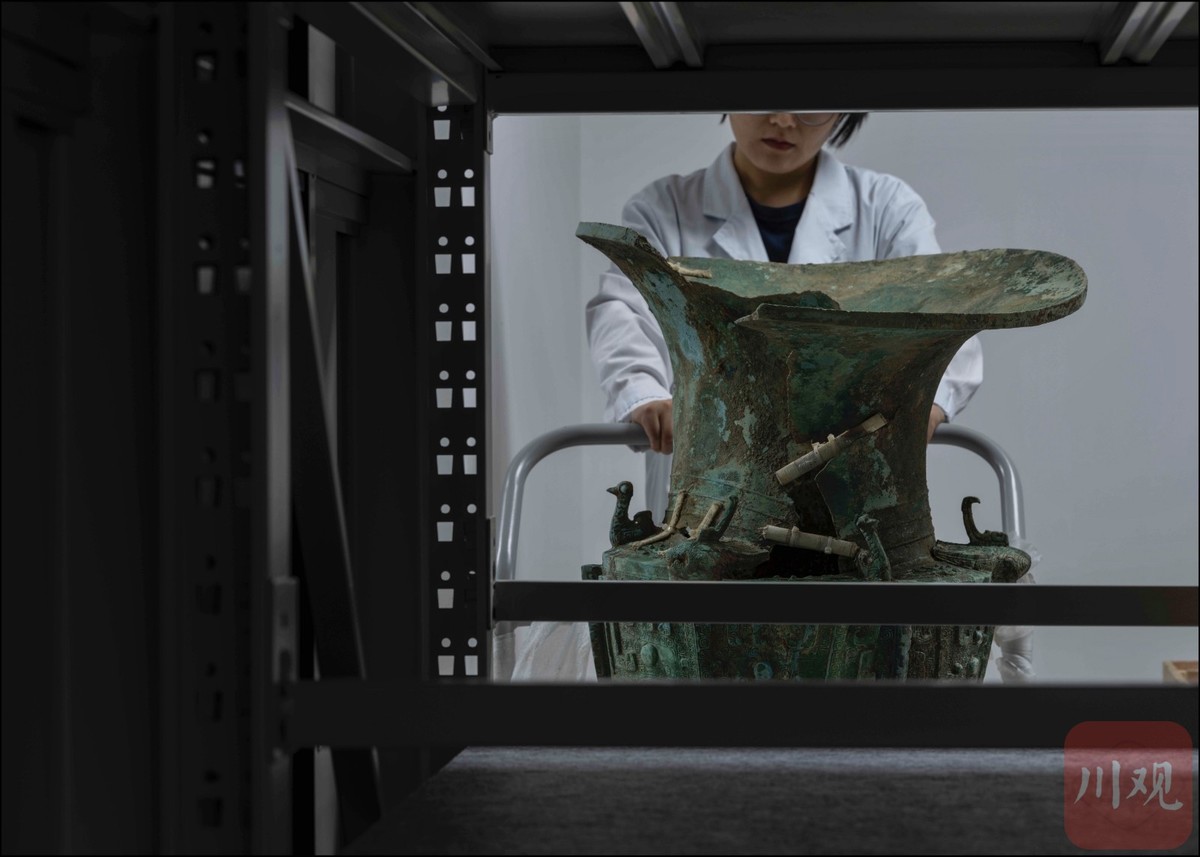 9月6日,三星堆遗址3号“祭祀坑”出土的青铜尊在四川省文物考古研究院广汉考古整理基地的仓库里等待专家的修复。