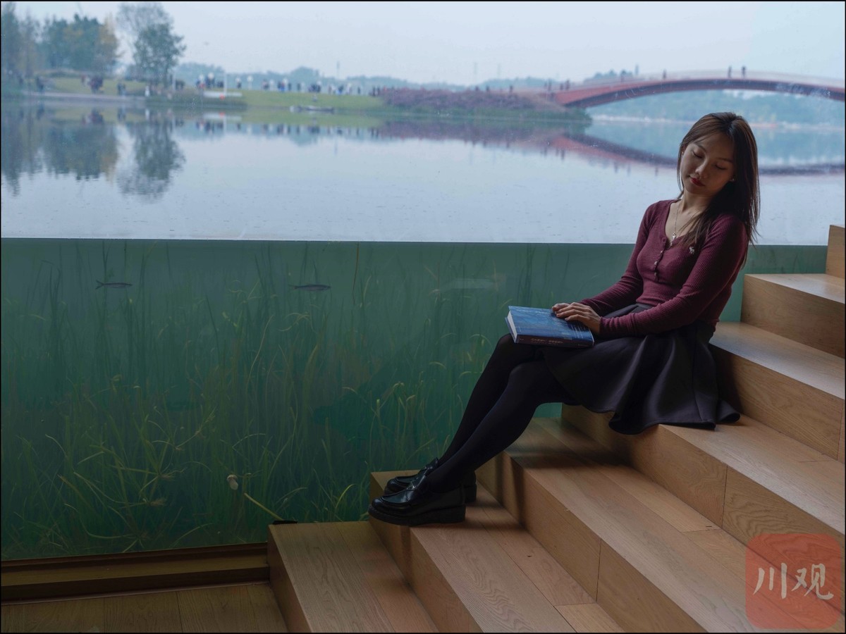 10月19日,成都兴隆湖边的水中书店吸引了众多市民前来打卡。靠湖一面的窗户是大家感兴趣的重点,兴隆湖180°展现在玻璃窗前,更奇妙的是,玻璃窗约有1米多深建在水下,水草摇曳,小鱼游动。