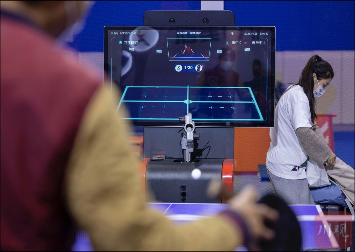 10月28日,一位市民与采用5G技术和人工智能控制的智能乒乓球“高手”搏杀。