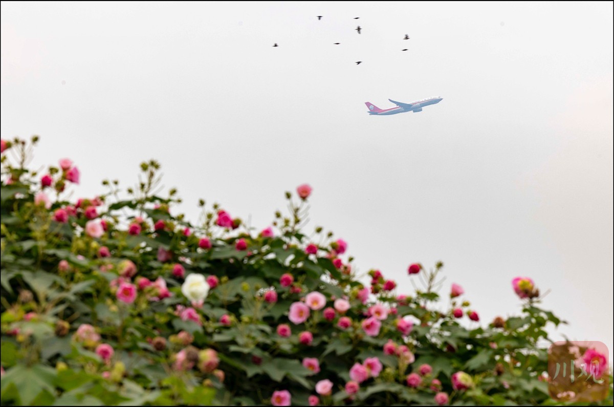11月3日,成都城南,一架客机掠过一片盛开的芙蓉花丛。“二十四城芙蓉花,锦官自昔称繁华”,成都因芙蓉花得名,芙蓉城简称蓉城。