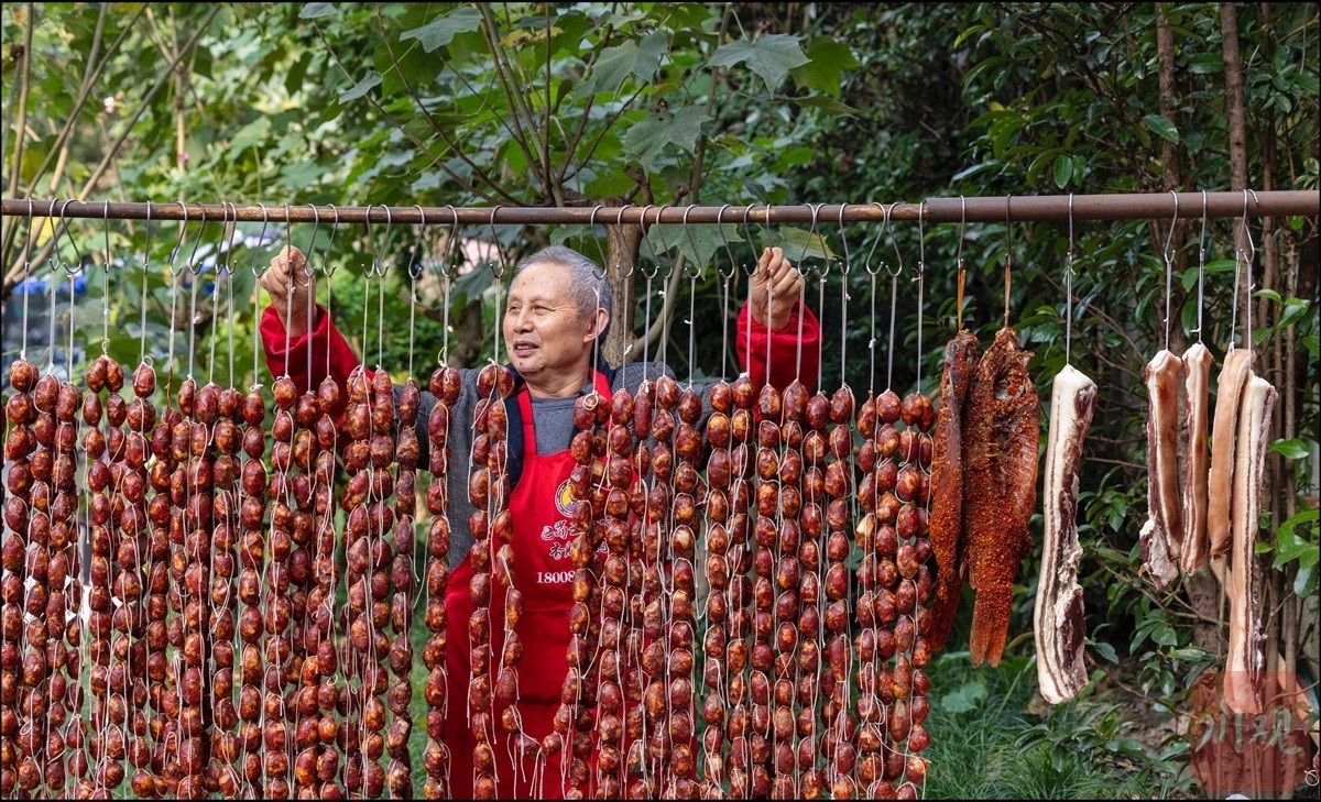 11月5日,有着“香肠一条街”之称的成都市新开寺街各大肉店开始忙碌制作晾晒各种口味的川味香肠。在这条街有名的香肠制作师王加明大爷,有着30年的制作经验,他制作的各种口味四川香肠麻辣甘香,深受顾客欢迎。