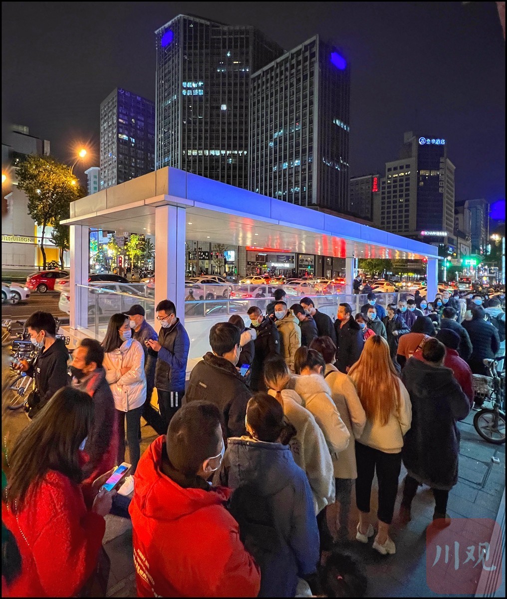 11月8日晚,成都市中心春熙商圈,前来进行核酸检测的商家、居民排起了长队有序等待检测。