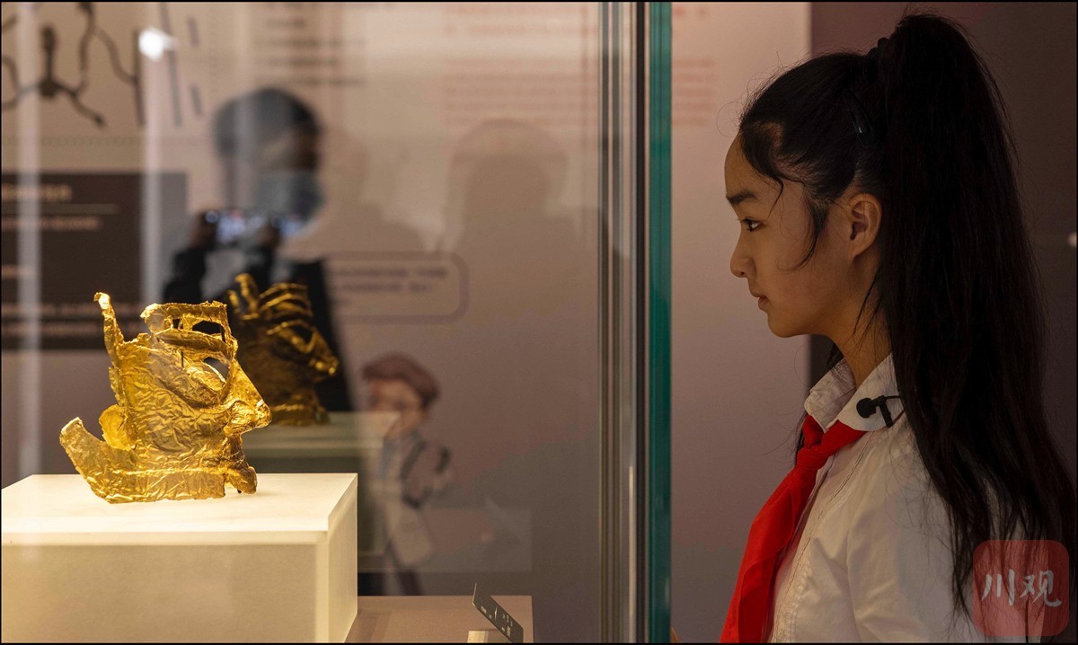 11月26日,今年三星堆遗址3号坑出土的金面具在文物修复馆里与参观者隔空相望。