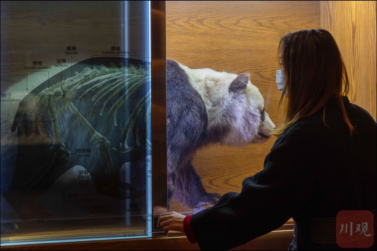 12月2日,一名游客借助高科技虚拟现实设备,看到大熊猫的骨骼、肌肉、消化道各部位的结构,能生动有趣地了解大熊猫生活习性。受到疫情影响暂时闭馆的成都大熊猫博物馆重新开放。