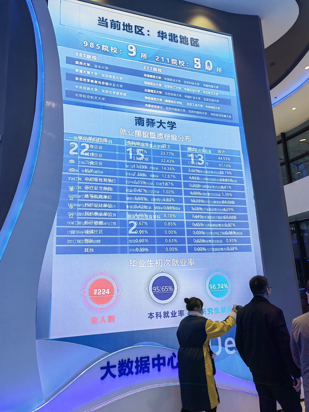 走进展馆一楼,迎面就是从大数据得来的“高考选校指南”,这个应该是各位家长最重视的吧。大屏上能够清晰看到全国各大高校的档次、学生人数、就业前景等诸多信息,孩子们可以早早了解到自己心仪的专业和学校,早立奋斗目标。