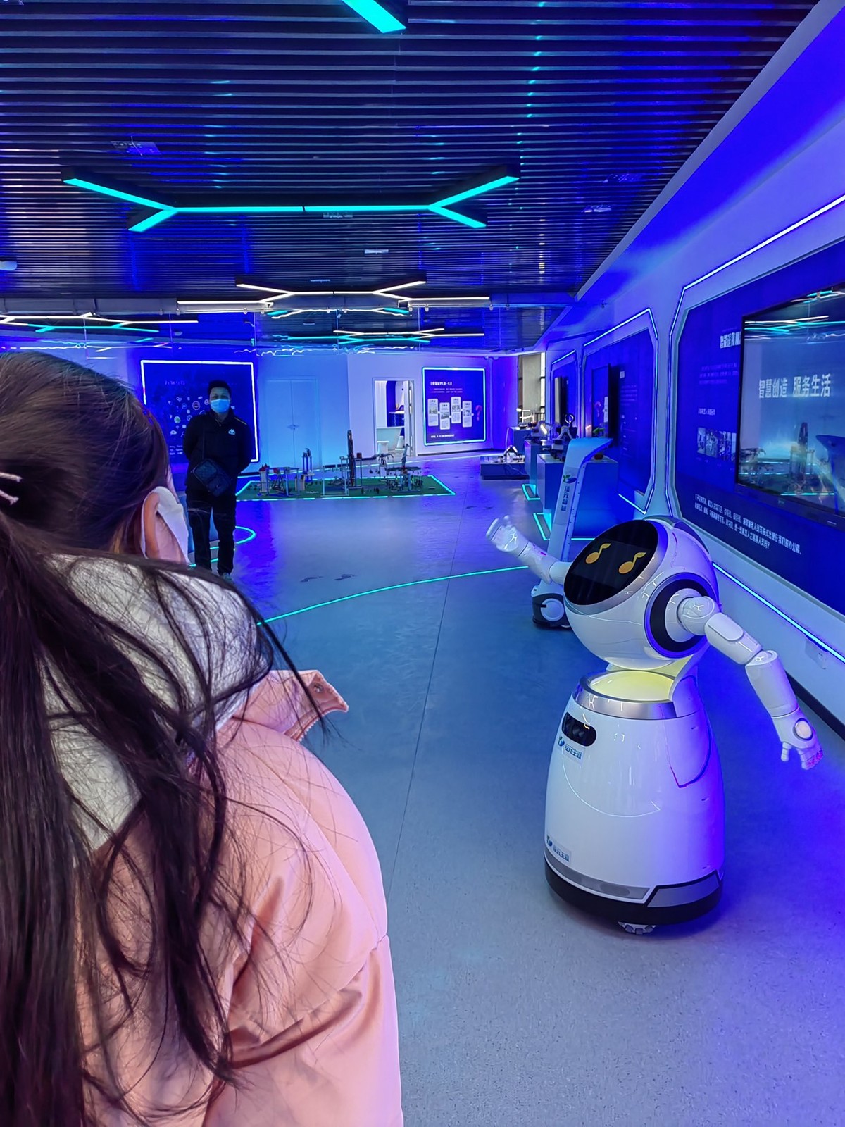 走上三楼,最先就是人工智能馆,记者感觉更加好玩。在这里,孩子们可以与机器人下棋,当然肯定是下不过的;可以与机器人对话,看它跳舞;可以看机器人怎么自己选路线送餐;可以看机器人在各行各业中的运用。甚至你可以拼出一个乐高游乐场,并通过编程让自己的乐高机器人跳舞……这里应该是小男孩的最爱了。