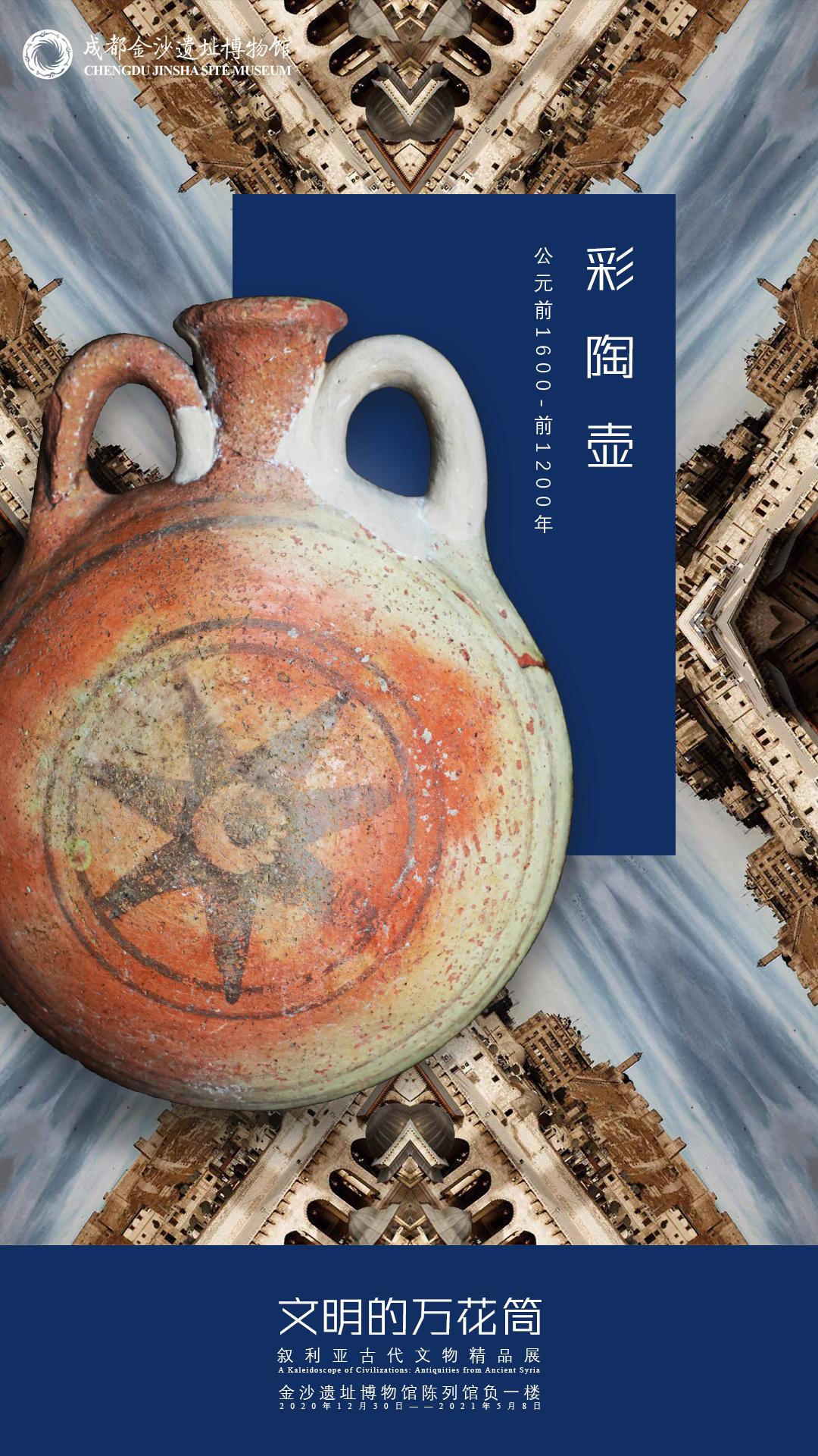 英国人类学家爱德华•泰勒曾说过,“凡是有阳光照耀到的地方,均有太阳崇拜的存在。”太阳崇拜是在世界各地早期普遍存在的一种文化现象。在距今3000年左右的成都平原,古蜀人将太阳的形象刻画到珍贵的金器、铜器上献给天地山川。在两河流域地区,人们则为太阳神精心修建神庙。伴随着叙利亚漫长的历史进程,太阳图案经常出现在陶器、石雕、滚印等多类器物上。本次展览还展出了一件距今约3600年-3200年的彩陶壶,壶身上刻画出简洁直观的太阳纹饰。