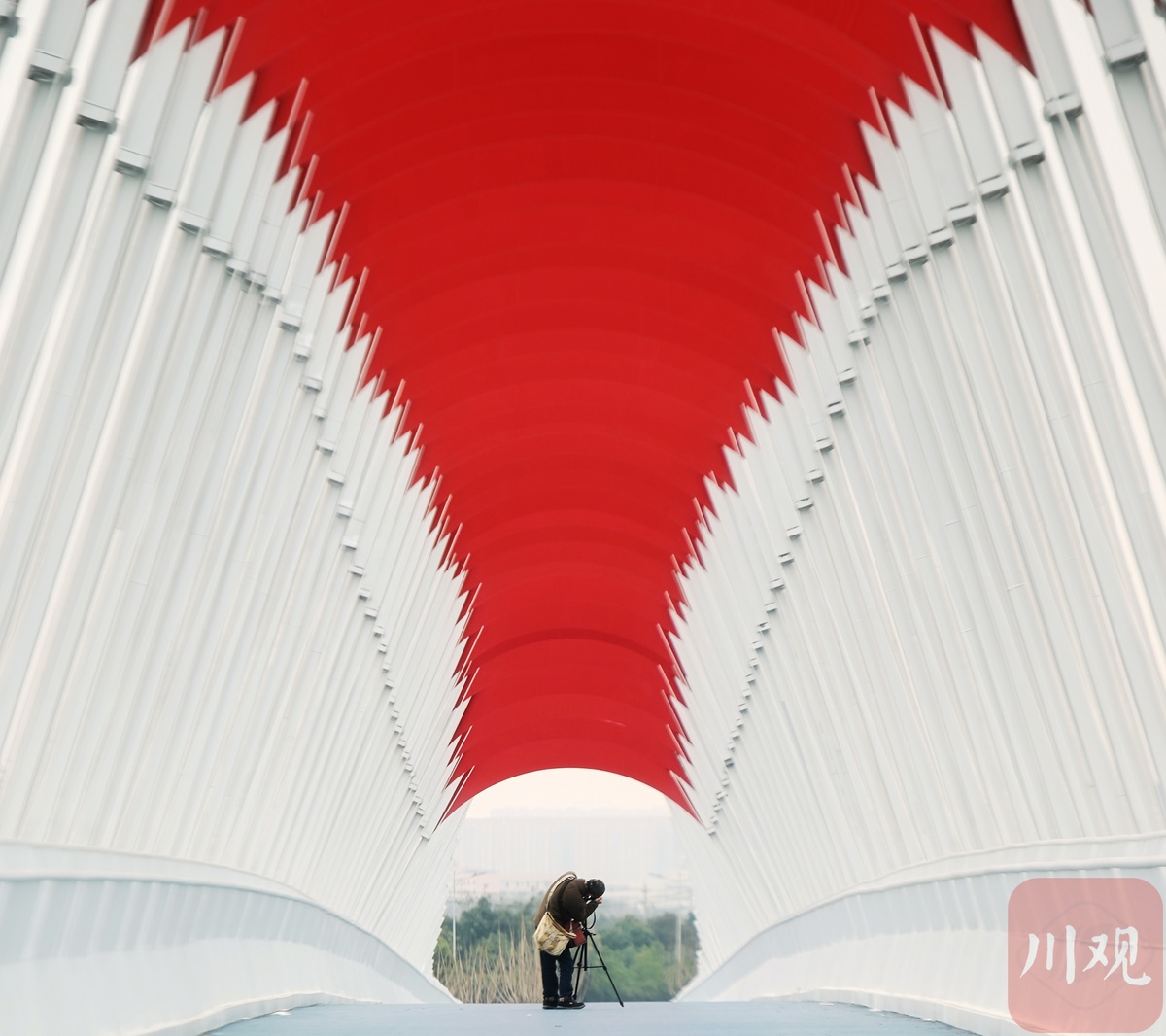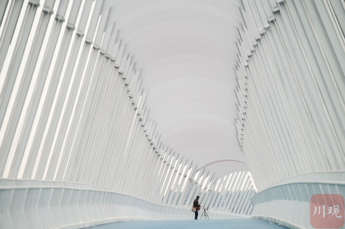 12月27日下午,在人气颇高的成都新晋网红桥“蕾丝桥”上,不少摄影爱好者寻找着最佳角度,不停按着手中的快门,“这座桥从一面看是纯白色、从另一面就是红色,真的很漂亮!”施大哥告诉川观新闻记者,他这是第三次来这里拍照了,“每一次来的天气都不同,桥的神采也不一样。”