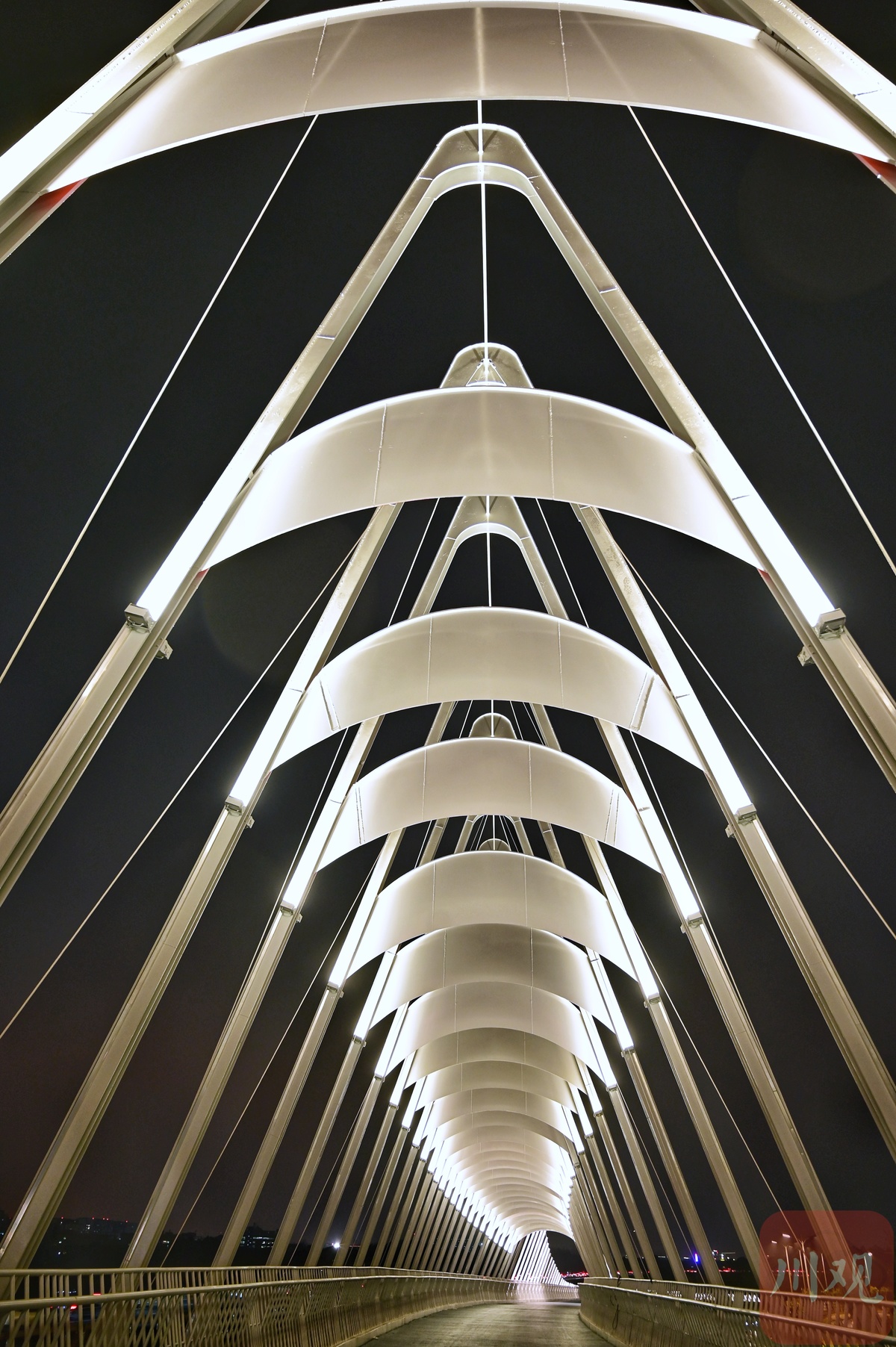 18点30分,天色渐暗,“蕾丝桥”的灯光逐级打开,菱形的轮廓曲线和有序排列的桁架,被灯光映射出蕾丝般编织的肌理,展现出与白天截然不同的优雅和浪漫形态。不少市民趁着饭后的闲暇,漫步在景中并拍照打卡。