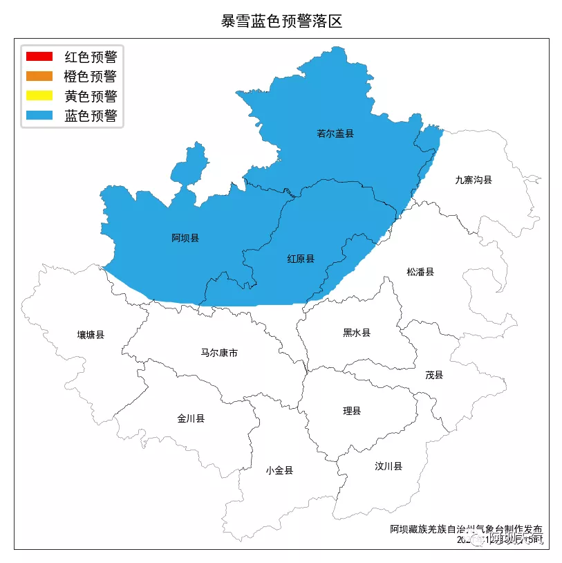 ★ 阿坝州气象台发布暴雪蓝色预警:30日20时到31日20时,阿坝州有一次明显降水天气过程。南部大部地区多云有阵雪(雨)或雨夹雪,北部多云间阴天有小雪(雨)到中雪(雨)或雨夹雪,其中阿坝县、红原县、若尔盖县将有五毫米以上降雪,过程来临时将伴有阵性大风,请注意防范。