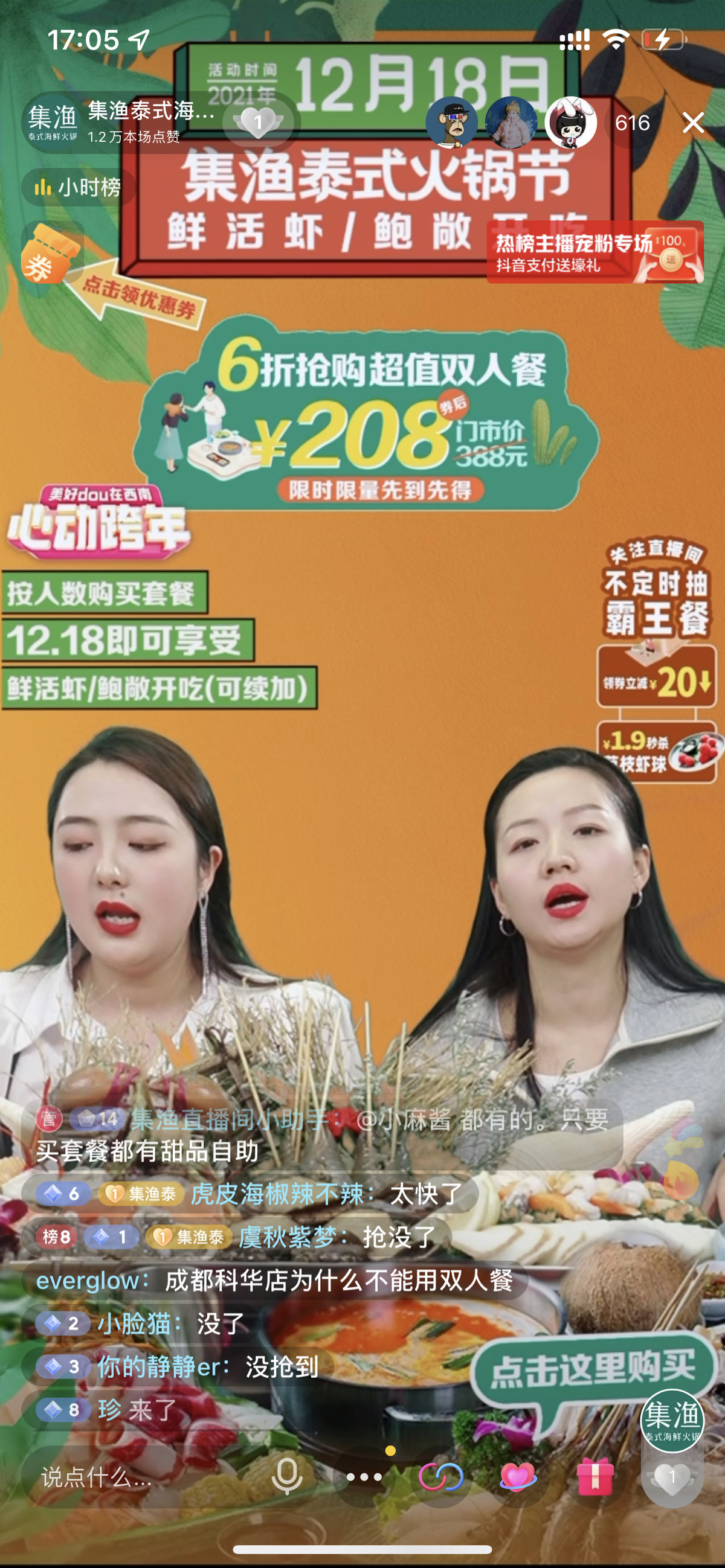 “雍容荟海鲜自助餐”从2020年开始运营抖音账号,目前粉丝2.9万,共发布33条短视频,累计播放量超过5000万。今年12月起,集渔泰式海鲜火锅开始尝试以直播形式售卖产品优惠套餐,截止目前共开播3场,总计销售额113万,单场最高销售66万。