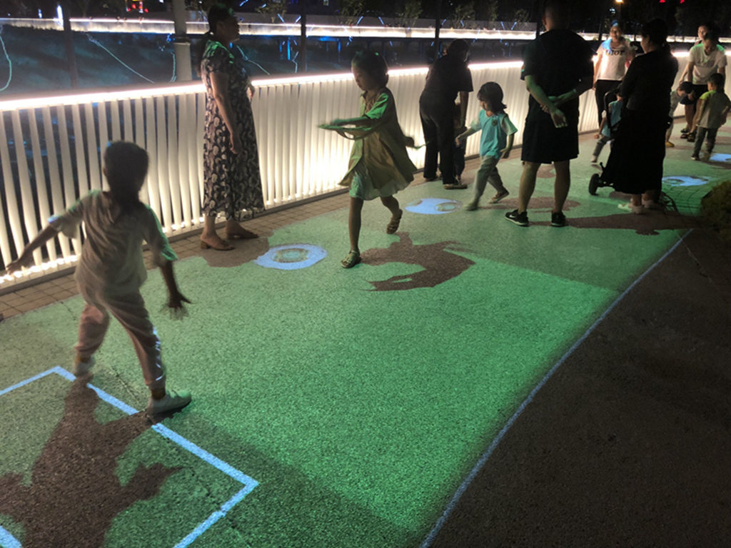 第九届中国(绵阳)科技城国际科技博览会开幕前夕,在绵阳城市重要门户和多处城市重要节点的一批智慧科技设施正式开建。2021年9月9日晚,绵阳草溪河会展段,一群小朋友分成两队,追逐着投射在地上的“光影足球”,在灯光下变身成为“足球运动员”上演一场充满童趣的足球比赛。另一边,地上一团团“光影花朵”簇拥着游人,随着脚步四散开来。沉浸式灯光互动装置带来的光影特效,让市民可以与投射在地面的光影进行有趣互动,沉浸式体验科技带来的乐趣。