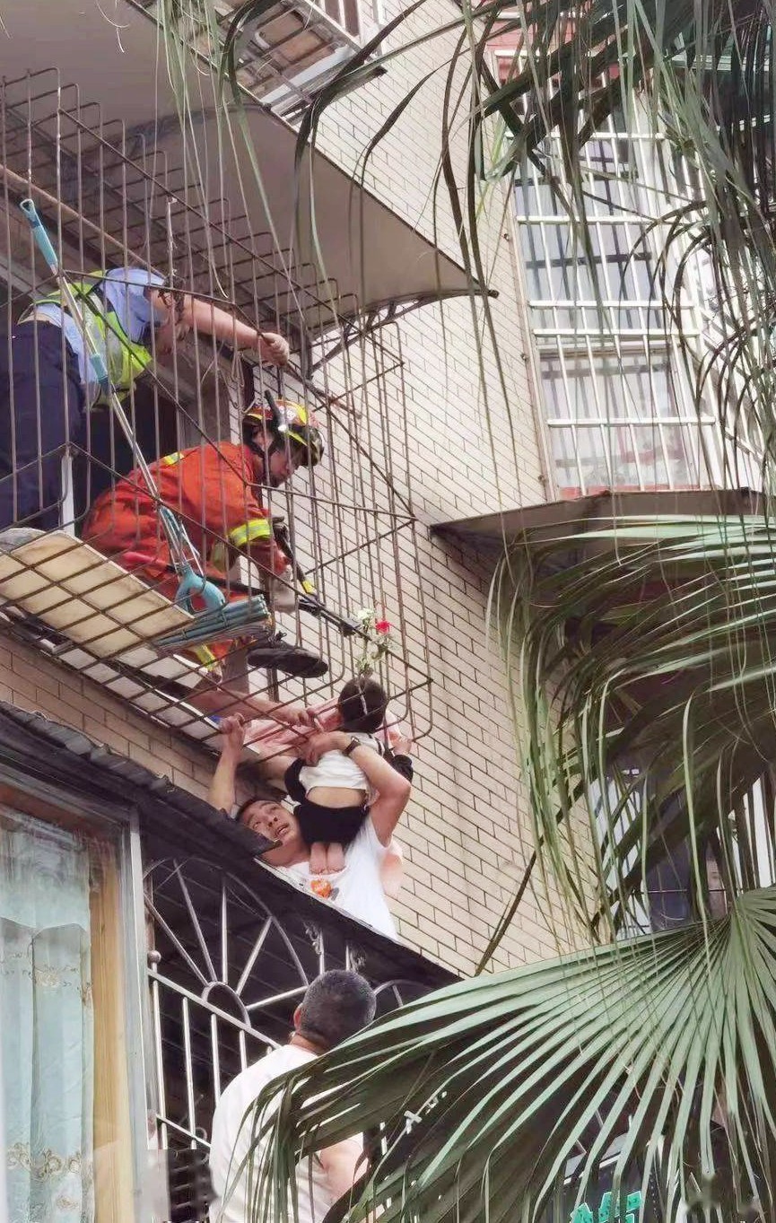 江油一2岁幼童爬窗脖子被卡防盗网,男子爬楼托举