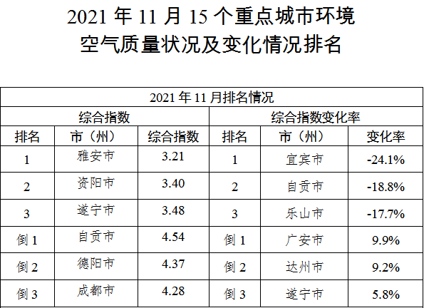 四川省生态环境厅相关负责人介绍,今年11月,15个重点城市中,环境空气质量改善同比较好的前3名依次为宜宾市、自贡市、乐山市,环境空气质量同比较差的前3名依次为广安市、达州市、遂宁市。6个非重点城市空气质量综合指数排名依次为甘孜州、阿坝州、凉山州、巴中市、广元市、攀枝花市。