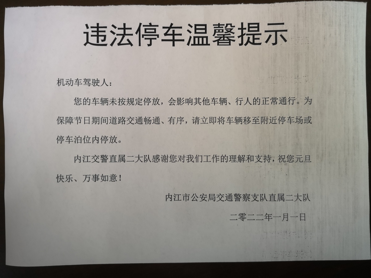1月1日,进入元旦假期,此时在内江主城区,随着车流的增大,不少在路上临时停车的车主收到一张交警贴的“温馨提示”。