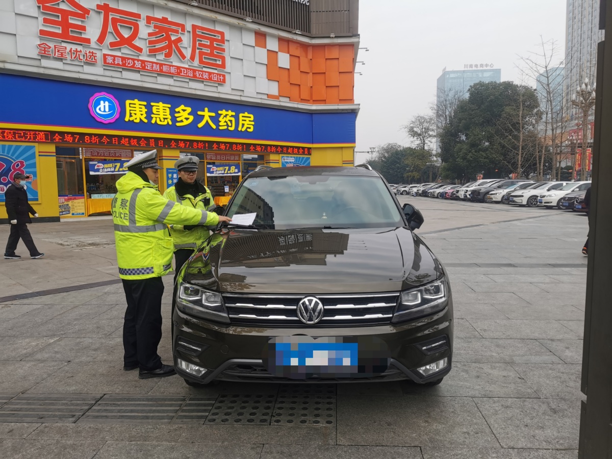 “驾驶员您好,今天是元旦节,暂不对您进行处罚,但是请您自觉遵守交通安全法规,文明停车。”当天下午,在东兴区汉安大道汇宇一品小区外,内江市公安局交警支队直属二大队一中队交警禹小龙正和同事一起对路边违停车辆贴温馨提示单,并宣传引导车主规范停放车辆。