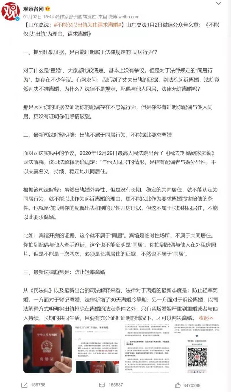 1月2日,外省某法院微信公众号发出了一篇名为《不能仅以“出轨”为理由,请求离婚》的文章。文章中提到,面对“同居行为”在司法实践中的争议,2020年12月29日最高人民法院出台了《民法典·婚姻家庭编》司法解释,该司法解释明确规定:“与他人同居”的情形,是指有配偶者与婚外异性,不以夫妻名义,持续、稳定地共同居住。