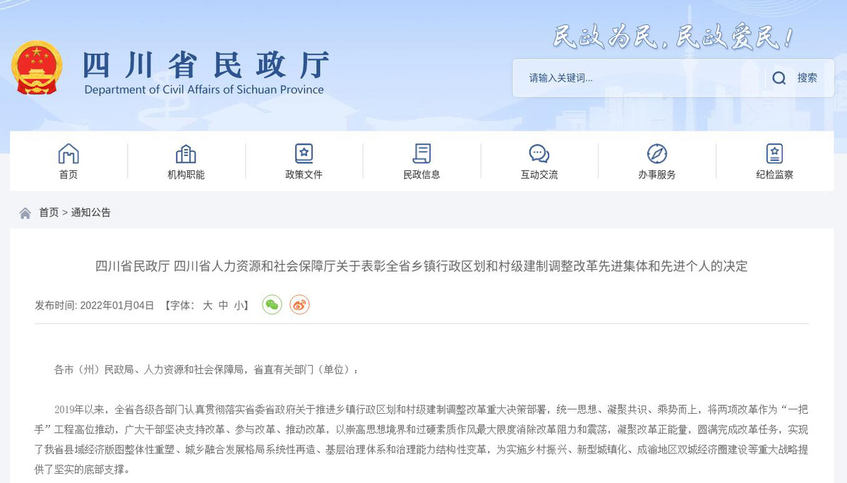 2019年以来,全省各级各部门认真贯彻落实省委省政府关于推进乡镇行政区划和村级建制调整改革重大决策部署,将两项改革作为“一把手”工程高位推动,广大干部坚决支持改革、参与改革、推动改革,凝聚改革正能量,圆满完成改革任务,实现了我省县域经济版图整体性重塑、城乡融合发展格局系统性再造、基层治理体系和治理能力结构性变革,为实施乡村振兴、新型城镇化、成渝地区双城经济圈建设等重大战略提供了坚实的底部支撑。