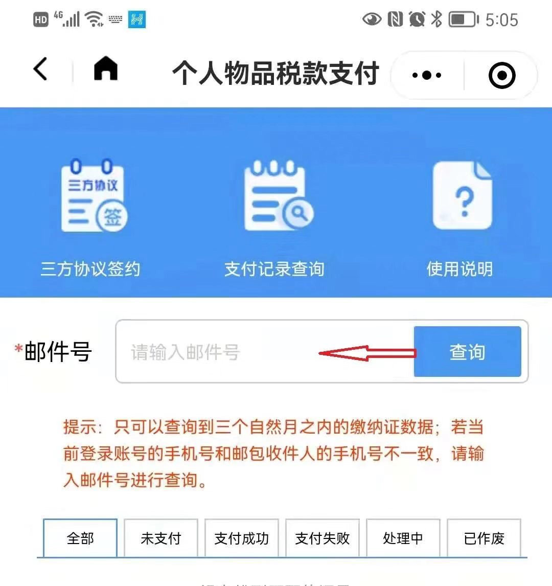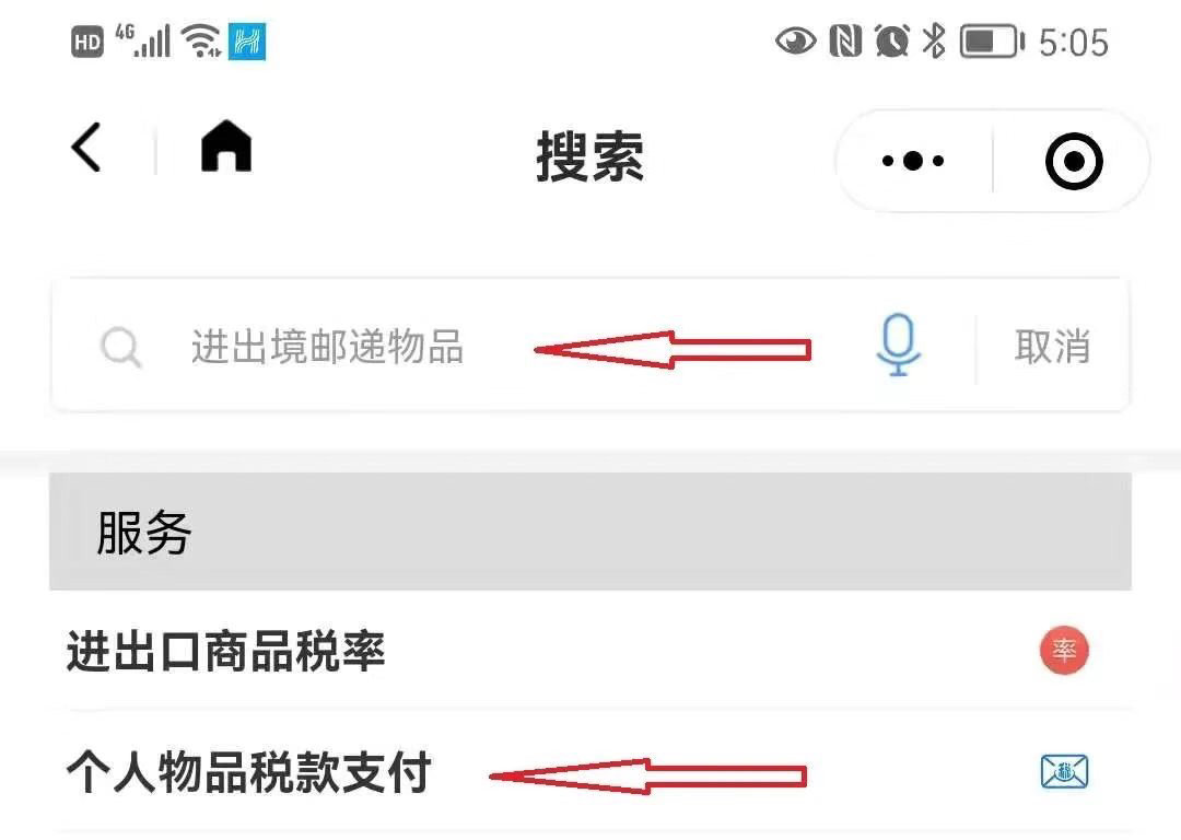 第四步:搜索并点击“个人物品税款支付”服务