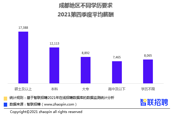 《报告》显示,从学历要求看,2021年第四季度薪资水平仍然整体呈现学历要求越高,招聘薪酬越高的特征。成都地区硕士以上学历招聘月薪第一,为17388元/月。