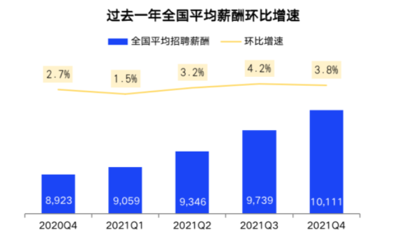 智联招聘第四季度在线数据显示,2021年第四季度全国38个核心城市平均薪酬首次破万,达到10111元/月,环比上涨3.8%,较去年同期的8923元/月高13.3%。2021年以来,38城企业平均招聘薪酬逐季稳步上涨,这一定程度反映出,相对于大规模招聘,企业越来越倾向于高薪聘请少量优秀人才,减少边际人工成本。四季度正值校招季,各大厂争相比拼应届生薪资待遇,去年第四季度更是刷新历史水平,这也是薪酬上涨的一个原因。