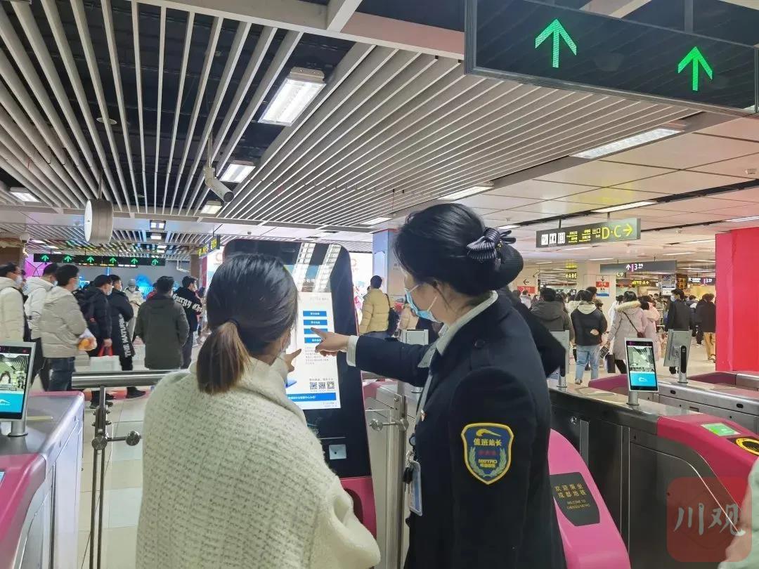 为满足乘客出行需求,元旦节期间,成都地铁采用大客流运行图、提升线网运营频次、采用全日高峰等措施,优化调整线网运力。同时严格落实进站乘客亮码测温、佩戴口罩、通风消毒等要求,针对车站自动售票机、闸机以及楼梯扶手、公共卫生间门把手、直梯轿厢四壁等重点部位强化消杀工作,并对单程票卡强化清洗消毒,确保乘客出行安全。