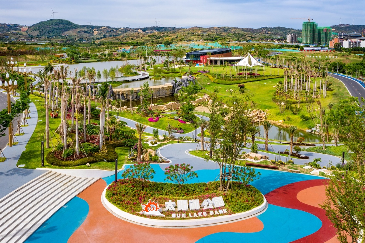 太阳湖公园建设有滨河公园休闲体验带、骑行环线、漫步环线、度假风情区、综合活动区、植物科普区、湿地体验区,形成“一湖、一带、两环、四区”的生态景观。