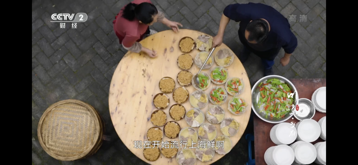 香碗,是川西坝坝宴中重要的一道传统食材,在当天的乡宴中,厨师们就在香碗中增添了虾等新的食材。食材在变、乡宴在变,但人与人之前根植于故土的连接却没有变。