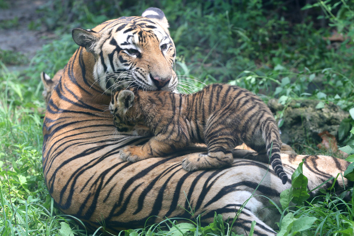 小老虎们2个月左右开始吃肉,6个月左右断奶。目前每只小老虎体重约100斤左右,和虎妈妈一起生活,每天每只要吃5斤左右的肉,包括牛肉、鸡肉和兔肉等。由于是母亲亲自带崽,所以三只小老虎很是活泼好动,经常可以看见三只一起玩耍打闹,虎妈妈还会教它们一些生活的本领。