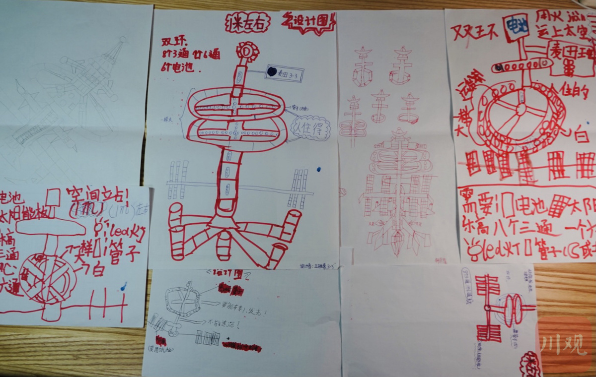 在“大本营”的一张茶几上,白色的“空间站”表面闪烁着黄色灯光,煞是好看。它是五个小朋友还未制作完成的“宝贝”,孩子们亲切地叫它为“麦几号”。记者还在房间内一角,看了一张张孩子们用红色水彩笔勾勒的设计图,上面还写了电池、三通管、六通管、太阳能板的数量明细。