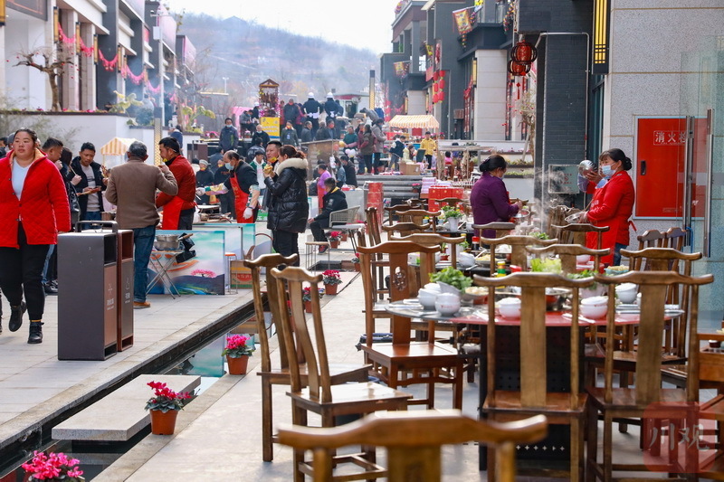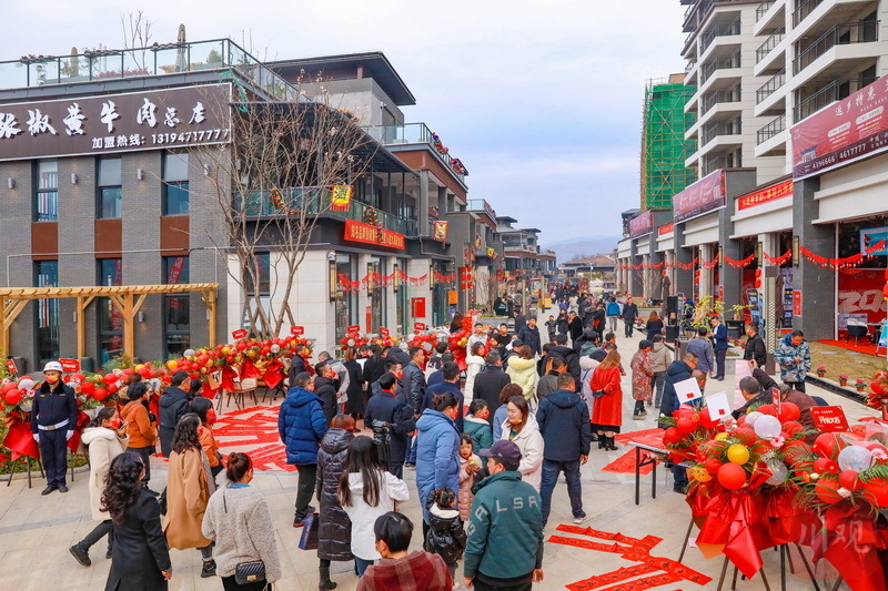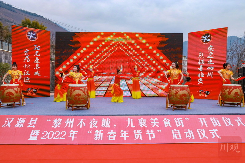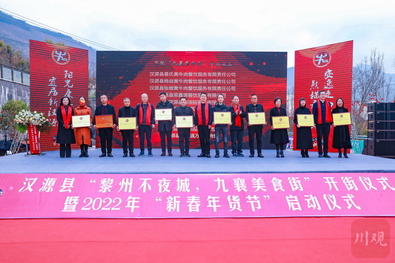 1月21日上午,雅安汉源县九襄镇南山府美食街张灯结彩、锣鼓喧天,“黎州不夜城,九襄美食街”揭牌开街,2022年汉源“新春年货节”系列活动也正式启动。