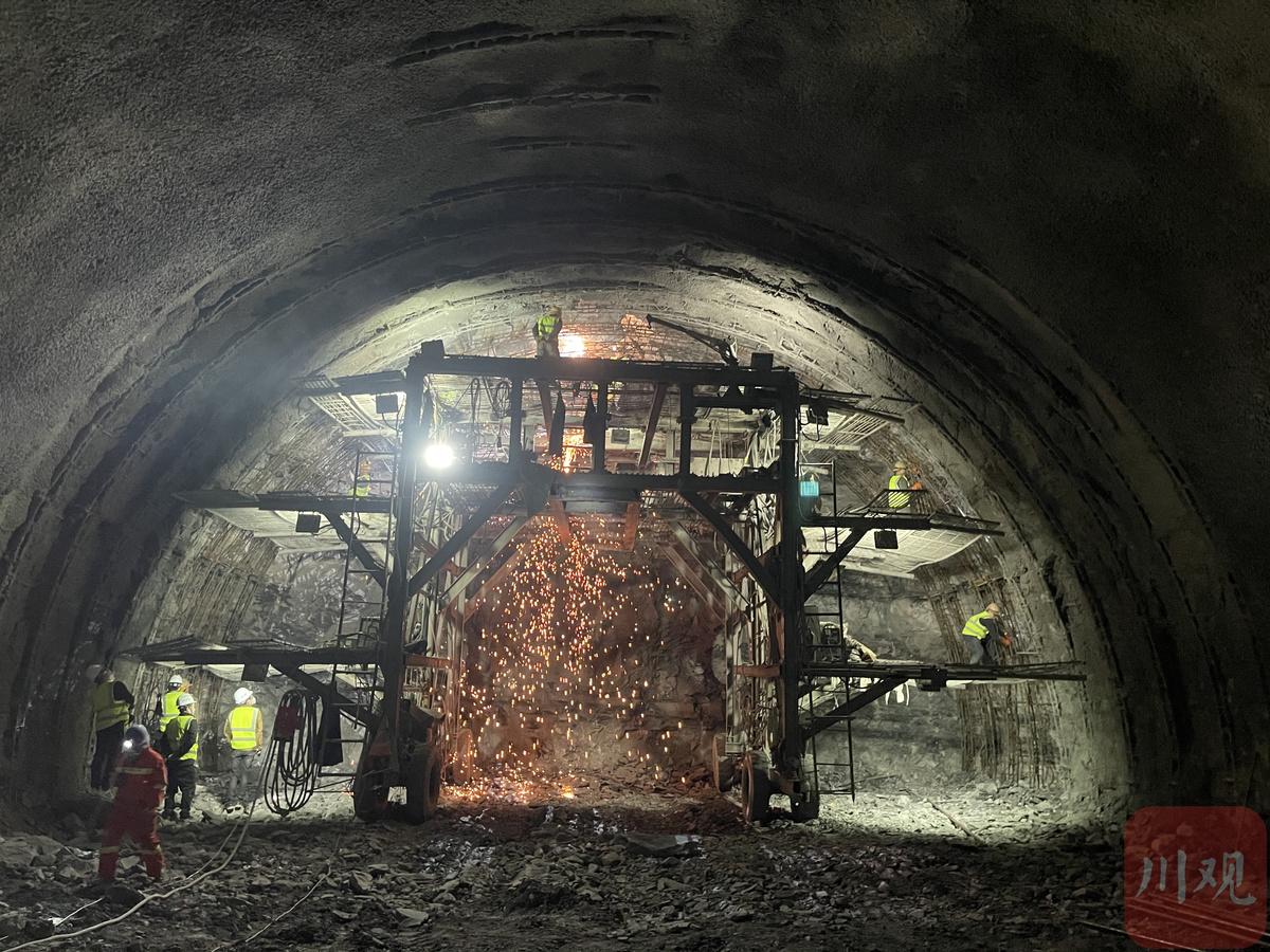 说话间,一辆挖掘机搭载着弧形的连接筋前来,几名工人上前抬起连接筋,放置到台车底部。台车顶部,在技术人员的指导下,连接筋拼接成型,电焊工开始工作,火花从高处滚落,分外好看。身穿红色制服的瓦检员赵德裕站在旁边,一直监测记录着异常气体的数值。