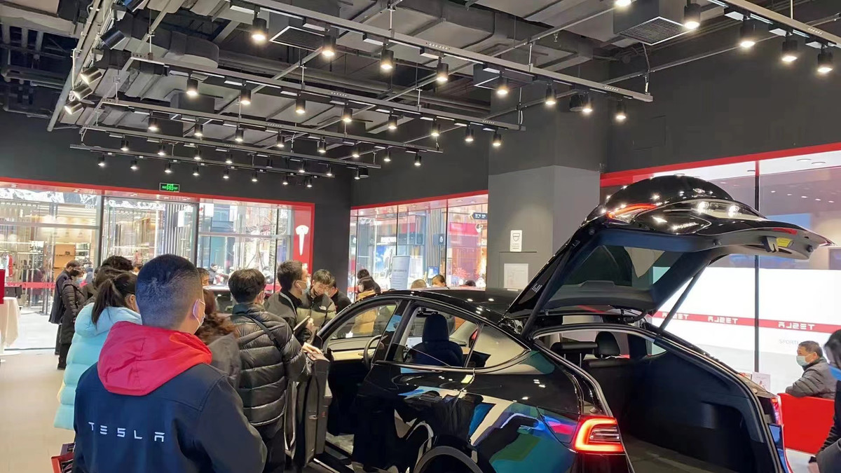 春节期间,看车的市民川流不息。(特斯拉成都太古里体验店供图)