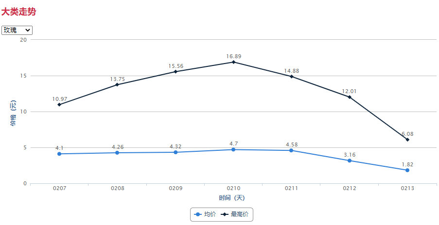昆明国际花卉拍卖交易中心数据显示,2月10日,情人节高峰期备货第六天,拍卖交易总量约461万枝左右,单头玫瑰A级最高价16.89元/枝,多头玫瑰最高价12.89元/枝,达到高点;12日,各地花店备货基本饱和,交易行情开始大幅下滑。情人节前一天,拍卖交易总量约350万枝左右,单头玫瑰A级最高价最高价6.09元/枝,多头玫瑰最高价7.05元/枝。