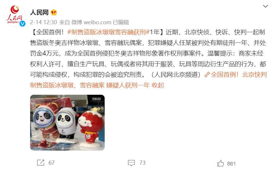 2月14日,2022北京新闻中心召开专场新闻发布会,介绍全面加强冬奥知识产权保护工作总体情况。会上通报了近期北京快判的一起制售盗版冬奥吉祥物“冰墩墩”玩偶案,这是全国首例侵犯北京冬奥吉祥物形象著作权的刑事案件。
