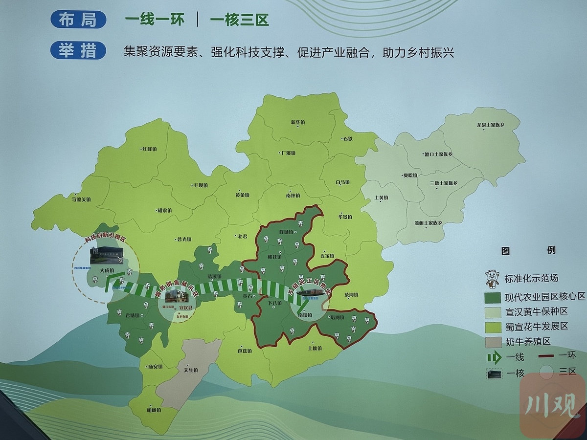 展示馆里,循环播放着宣汉县肉牛产业发展宣传片,展厅里的多个板块详细介绍了蜀宣花牛的选育过程、园区产业链条、科技创新、多款成品等,一处“智慧农业大数据平台”上实时呈现了20多家养殖场的监控画面。这些展示内容呈现出宣汉县良好的肉牛产业基础和进一步做大做强的雄心。