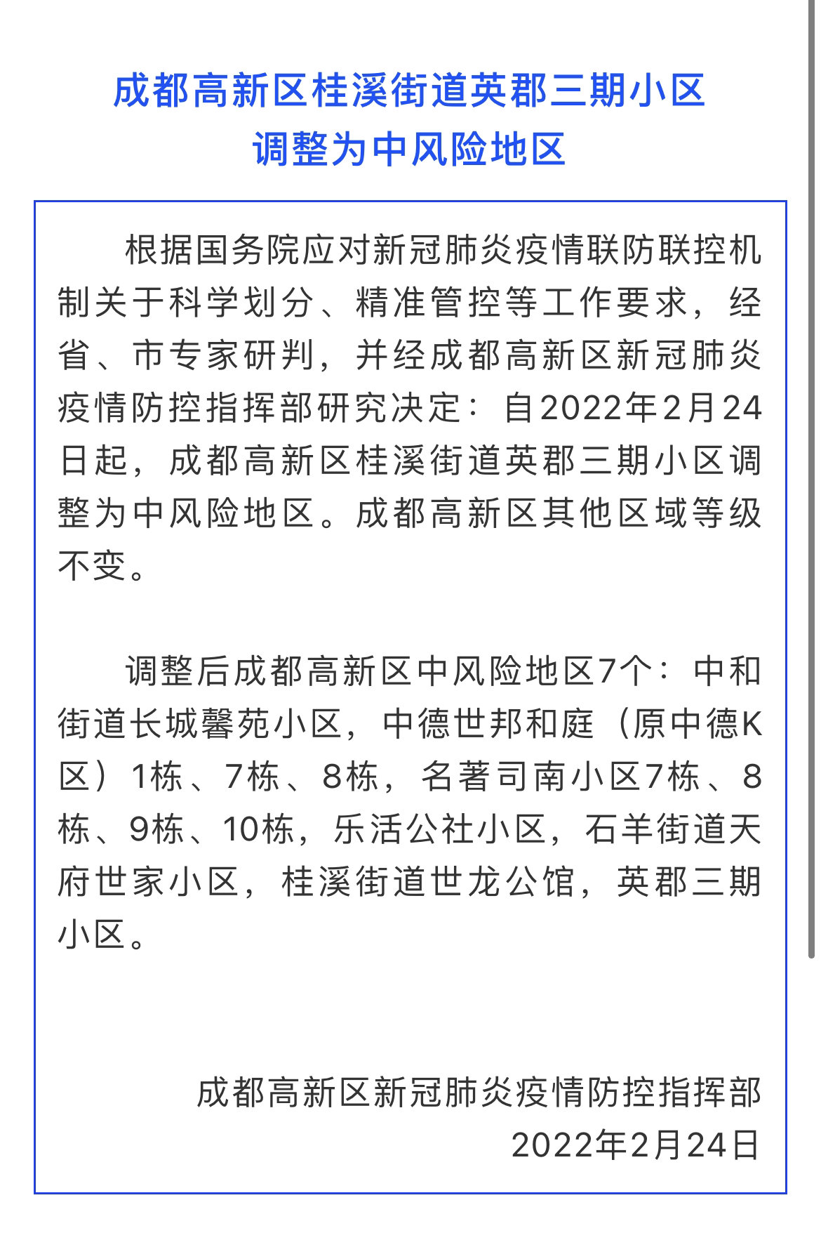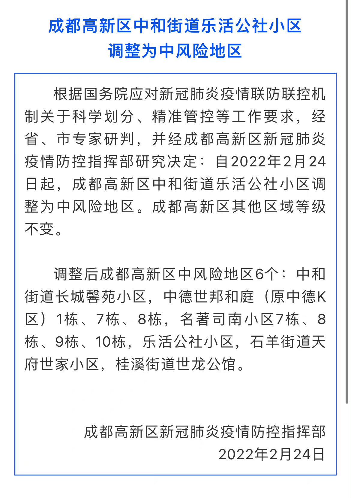 2月24日晚,成都高新区新冠肺炎疫情防控指挥部发布通告:成都高新区中和街道乐活公社小区、成都高新区桂溪街道英郡三期小区调整为中风险地区。