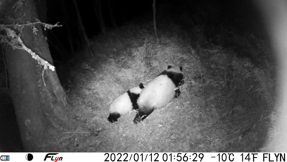 画面中大熊猫幼崽紧跟母亲身后,体型饱满圆润,步态轻盈悠闲,十分健康可爱。经工作人员初步判断,该大熊猫幼崽约在半岁左右,与今年1月12日夜间该区域8号相机拍摄到的大熊猫母子是同一对。
