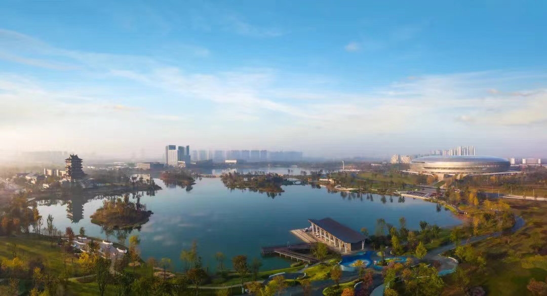 东安湖公园以自然山水为基底,打造为开放型城市生态公园。园区设计从建筑、美学、生态等多角度,以秀美的自然山水为基底,以丰富的文化元素为内涵,融入了林盘文化、桃花文化、竹文化等多重元素,着力打造“一湖一环、七岛十二景”的园区景观。